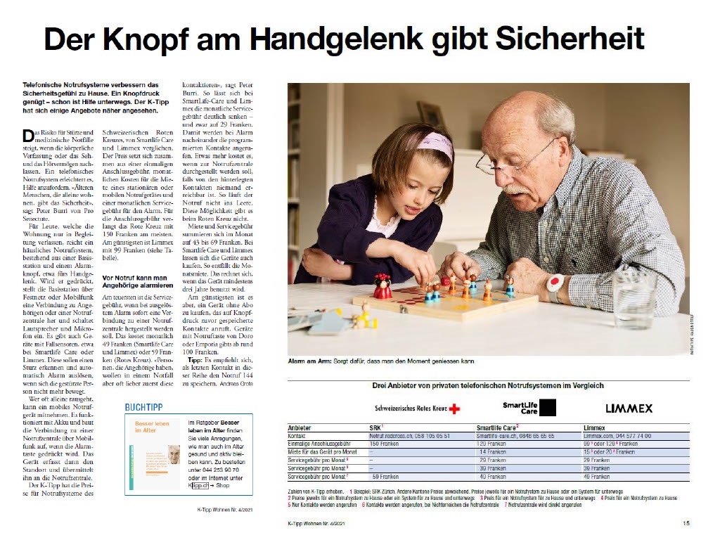 Der K-Tipp hat 2021 erneut Notrufsysteme für Senioren näher angesehen und Verglichen. Das Angebot von SmartLife Care schneidet dabei unter dem Strich am Besten ab.