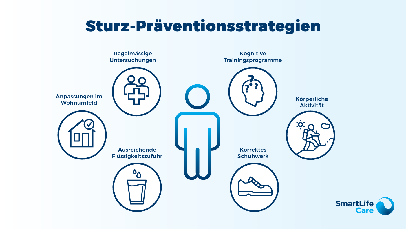 Die Vermeidung von Stürzen erfordert ein ganzheitliches Präventionskonzept, das sowohl physische, medizinische als auch umweltbedingte Faktoren berücksichtigt. Zu den wichtigsten Massnahmen zählen: