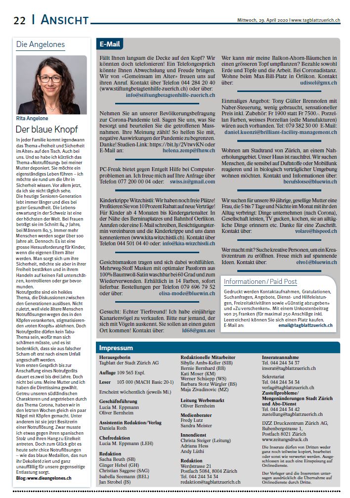 Tagblatt Zürich - Der blaue Knopf - Rita Angelone - 29.04.2020
